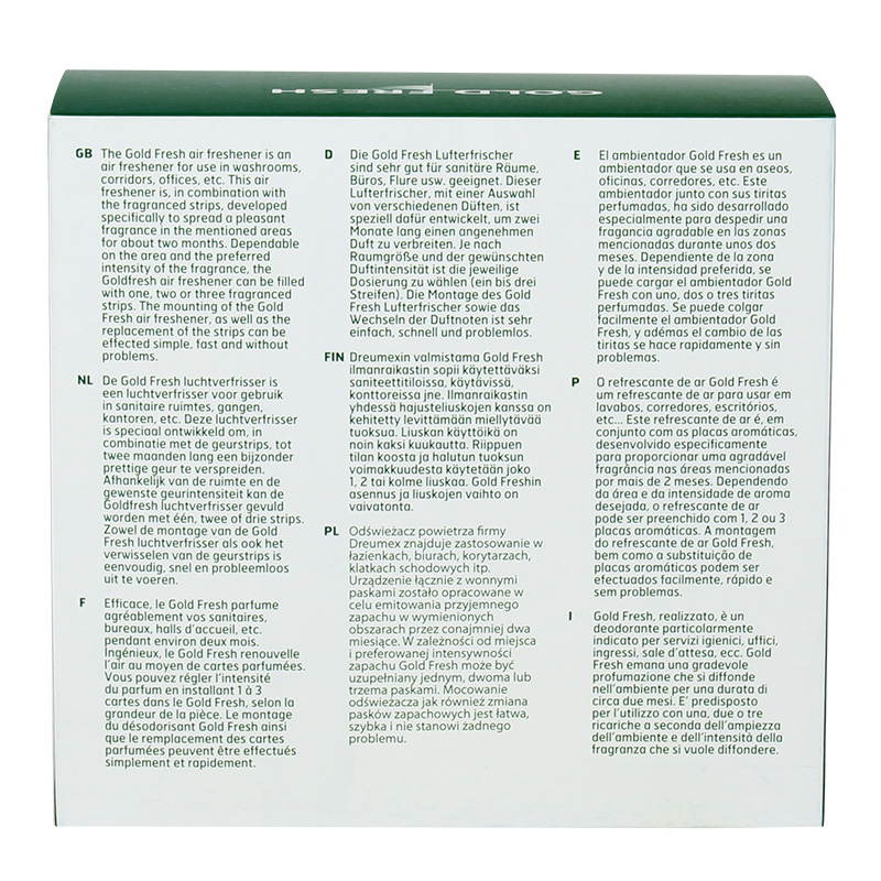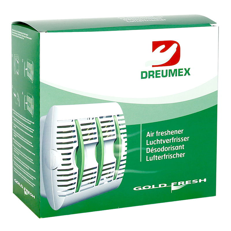 Dreumex Gold Fresh est un déodorisateur qui s’utilise dans les espaces sanitaires, bureaux, couloirs, etc. Facteur important pour une perception de propreté, il est conçu pour dégager une odeur particulièrement agréable pendant deux mois. Aucune pile n’est nécessaire. Fonctionnant sans piles, facile et rapide à monter, vous ajoutez ou remplacez les cartes très simplement.
