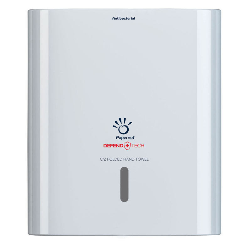 Le distributeur blanc Defend Tech pour essuie-mains pliés en C et Z, permet une distribution facile et hygiénique de chaque feuille. Sa petite taille le rend parfaitement adapté aux petits espaces.