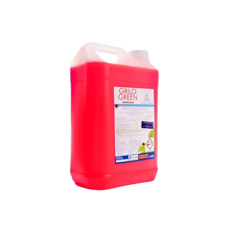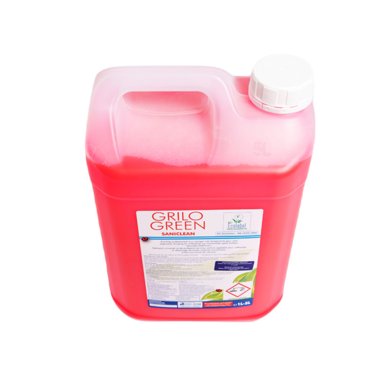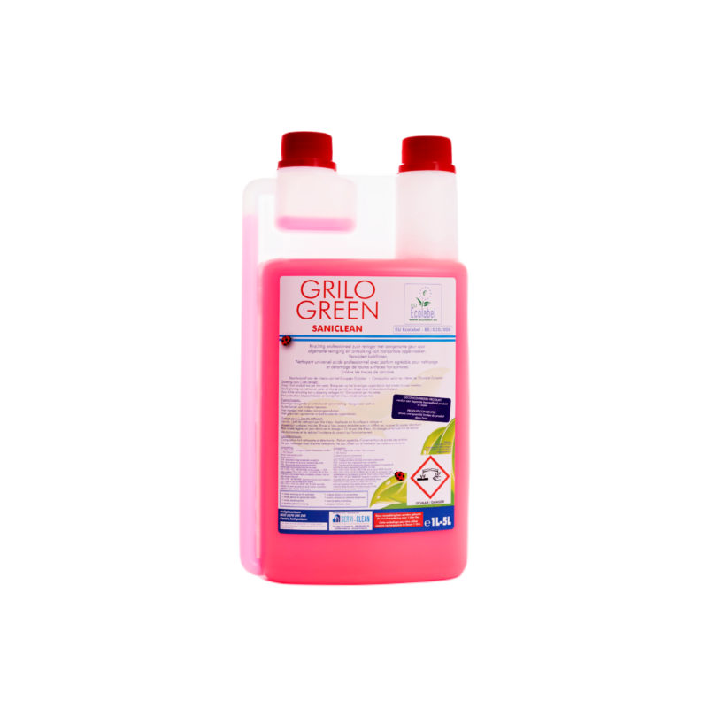 Grilo Green nettoyant universel et acide professionnel avec un parfum agréable, conçu pour un meilleur  nettoyage et détartrage des surfaces horizontales. 1L / 5L