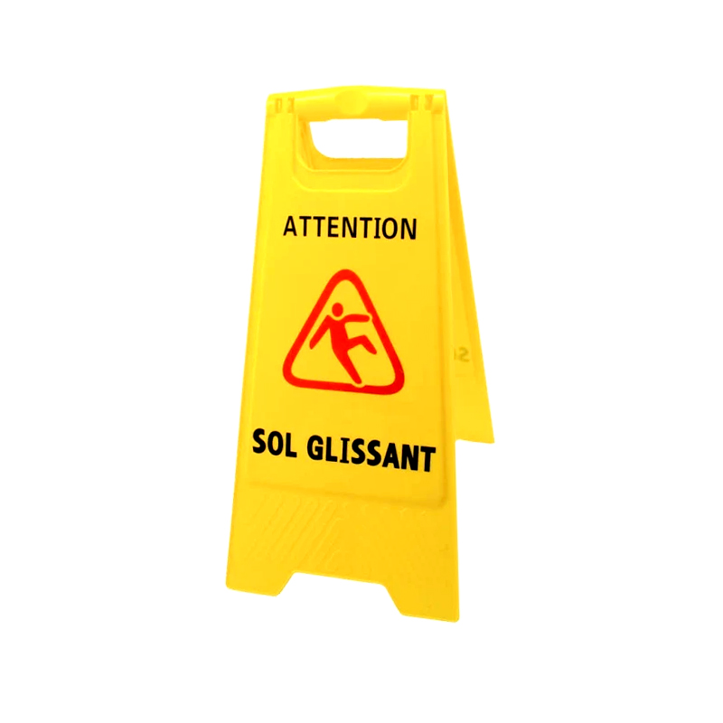 Signalering aan beide zijden van het paneel waarschuwt gebruikers aan weerszijden van de natte grond. Met een afmeting van 300 x 620 mm en een netto gewicht van 680 gram is dit product compact op te bergen en verplaats je het moeiteloos. De tekst erop is in het Frans.